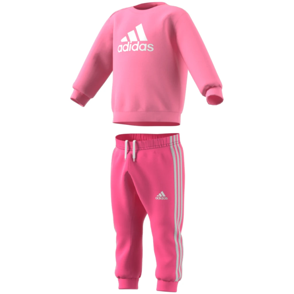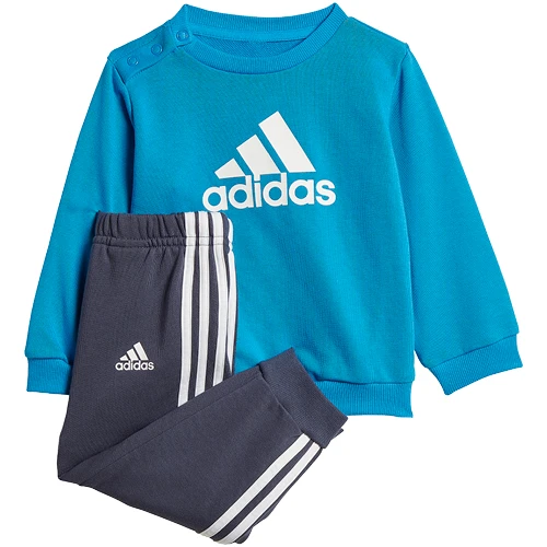 Dejlig blødt joggingsæt med rund hals og kant i ribstrik på trøjen. I halsen kan den desuden åbnes og lukkes ed tre små trykknapper, så den er nemmere at få på.