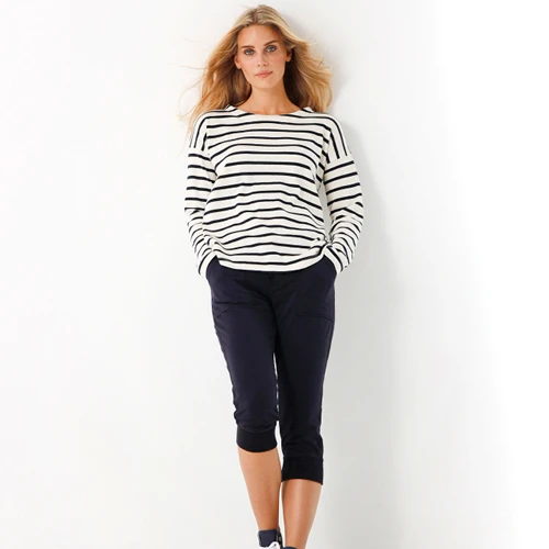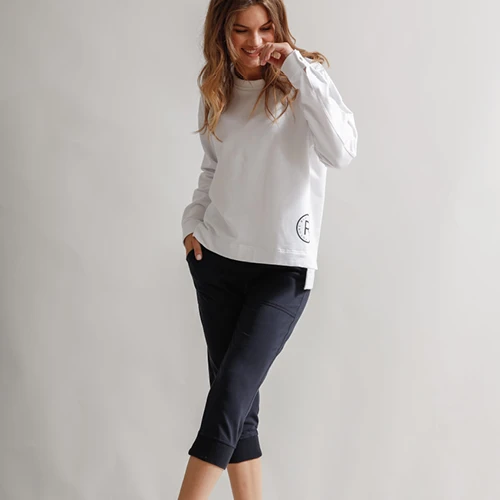 Smarte trekvarte busker i lækkert materiale. Bukserne har to forlommer og to baglommer. Nederst på buksebene er der et bredt elastisk bånd og i taljen er der et bredt bånd.