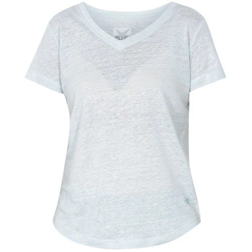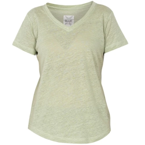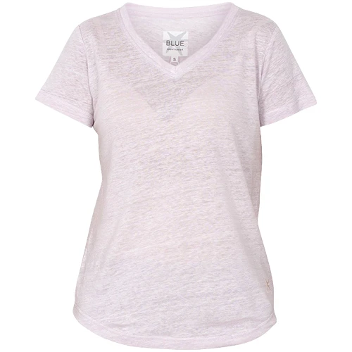 Den er produceret i et lækkert meleret materiale og har en bred v-udskæring og korte ærmer