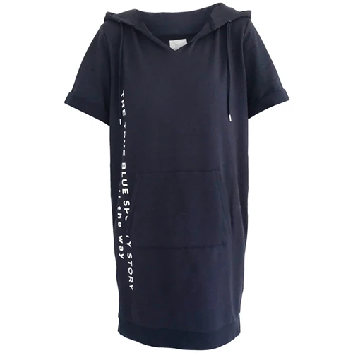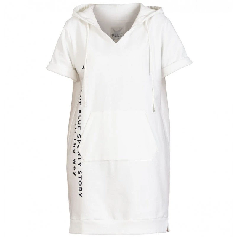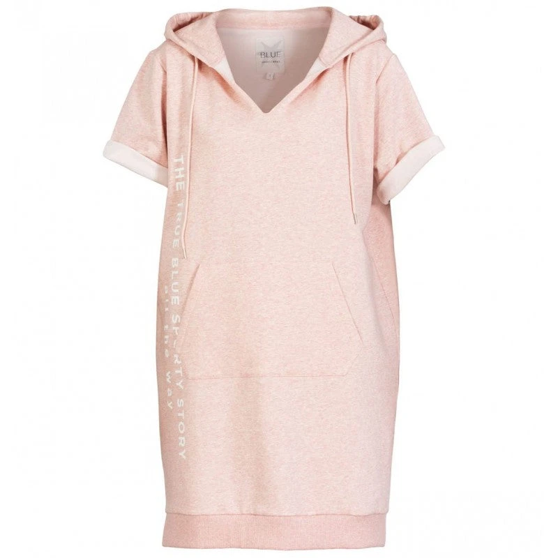 Blue Sportswear’s Katinka Tunica til kvinder er en lækker tunica og sweatshirt kombineret i én. Modellen egner sig både til hverdags- og fritidsbrug, og kan desuden både bruges alene som en afslappet sweatkjole eller sammen med et par bukser som en lang bluse. Modellen er fremstillet af et blødt og behageligt Pima bomuldsmix og har en afslappet og løstsiddende pasform med korte ærmer og opsmøg. Derudover er tunicaen også udstyret med en hætte med snøre, små slidser i siderne, samt en praktisk og rummelig kængurulomme og stort print på fronten.