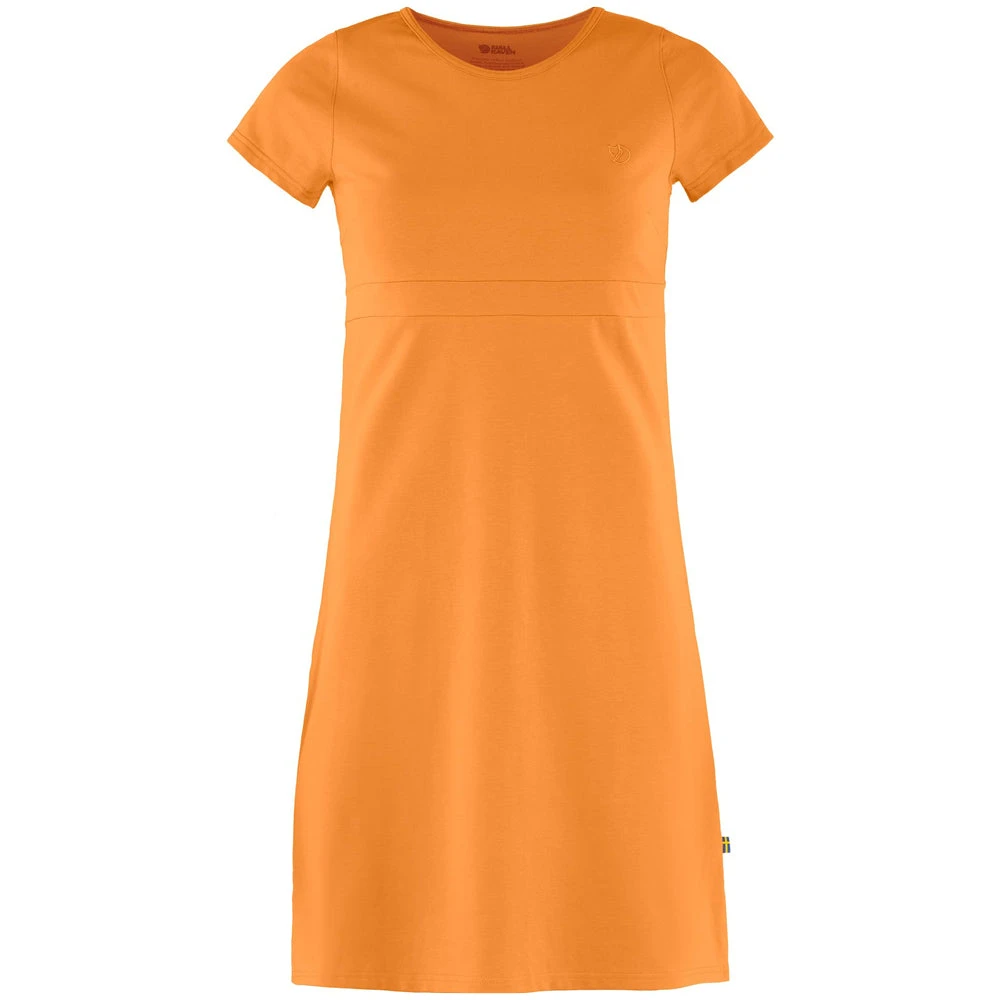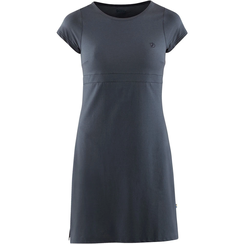 Fjällräven High Coast Kjole til kvinder er fremstillet i et økologisk materiale, som gør kjolen strækbar og yderst behagelig at have på. Kjolen har små korte ærmer og en åben halsudskæring samt et lille fint Fjällräven logo, som er broderet på venstre bryst. Derudover ses en skæring midt på kjolen, som skal fremhæve taljen.