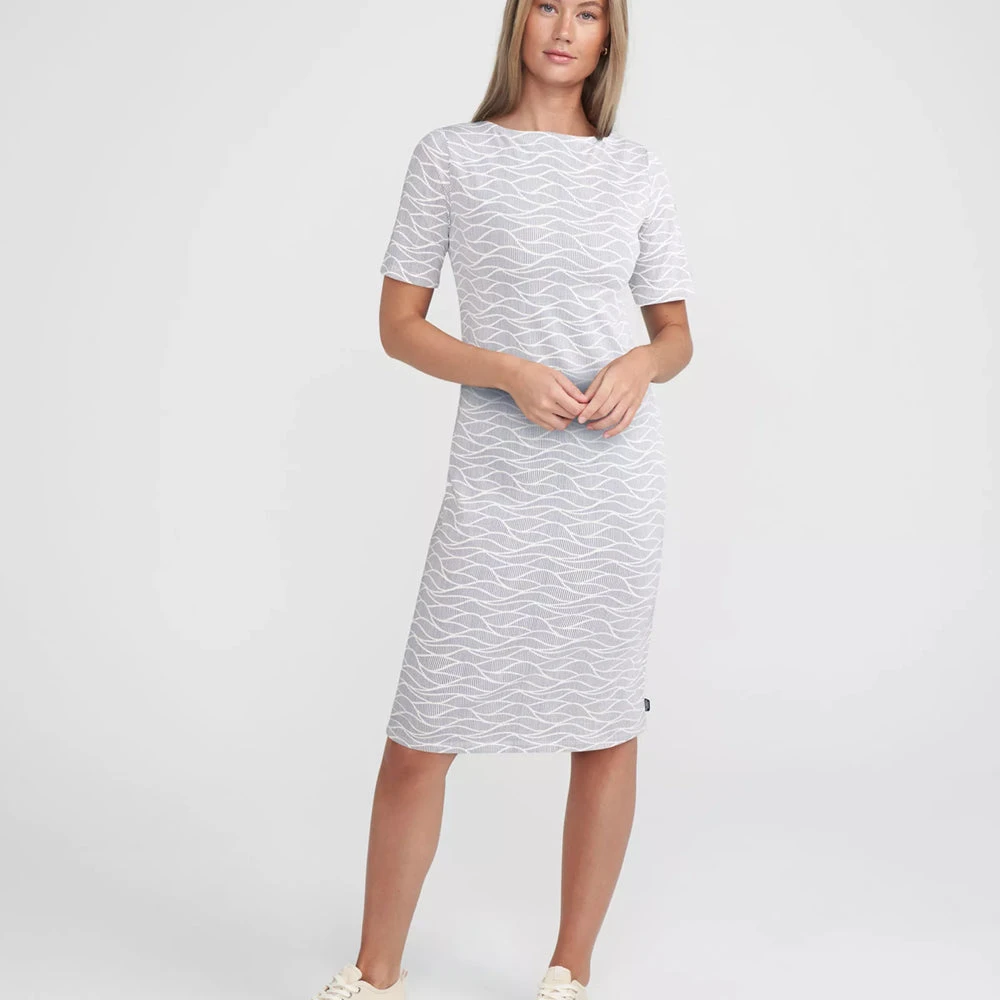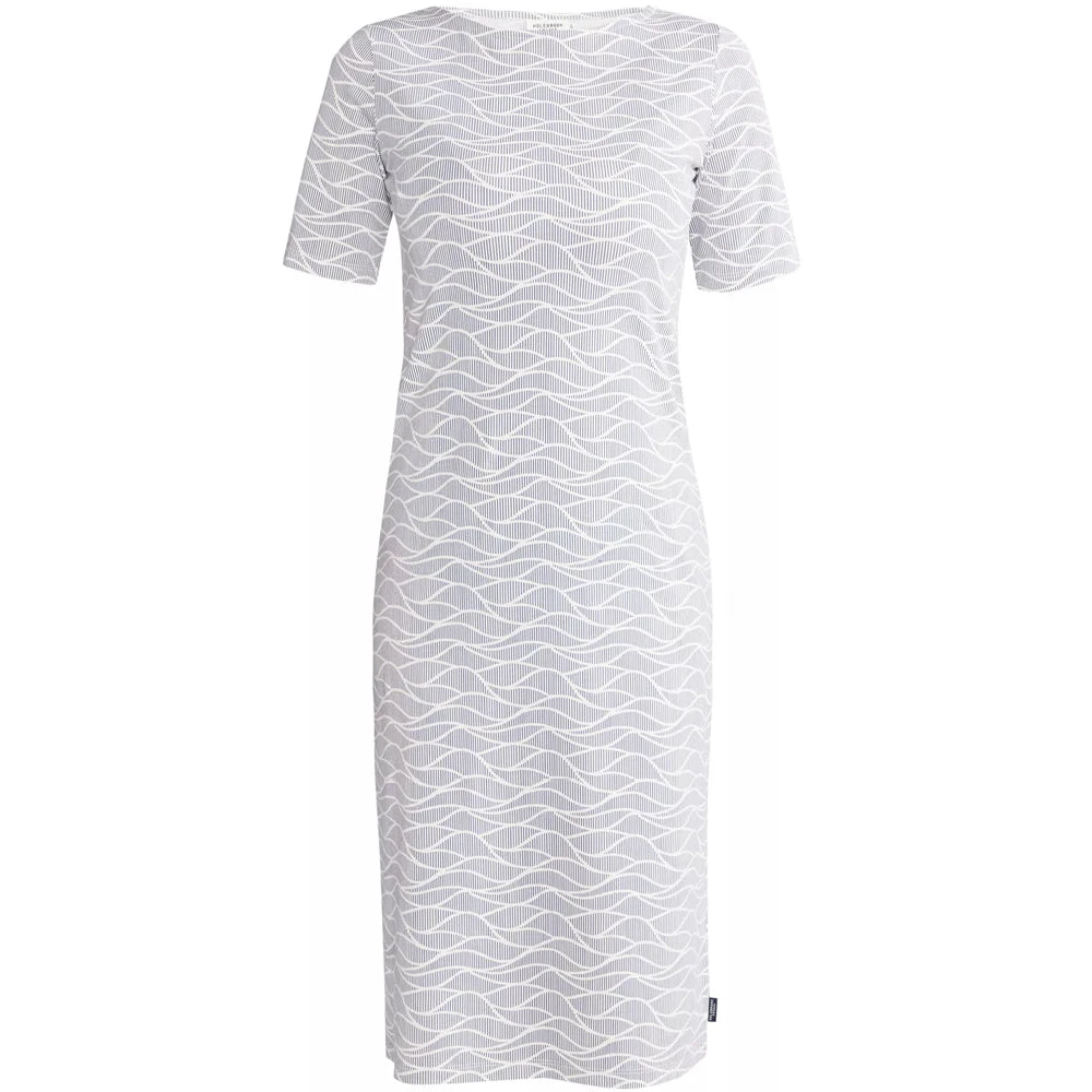 Let og blød t-shirt kjole til kvinder, som går ned under knæet. Kjolen er tætsiddende med en rund hals og har et flot mønster.