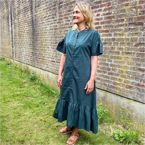 Den har korte ærmer med små læg, samt knapper ned foran.