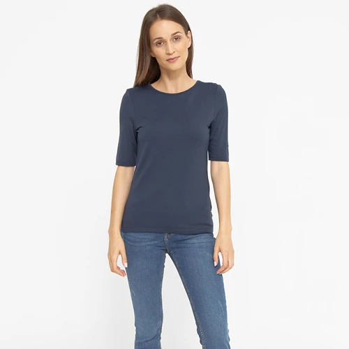 T-shirten er udstyret med rund halsudskæring, 3/4 ærmer og normal pasform.