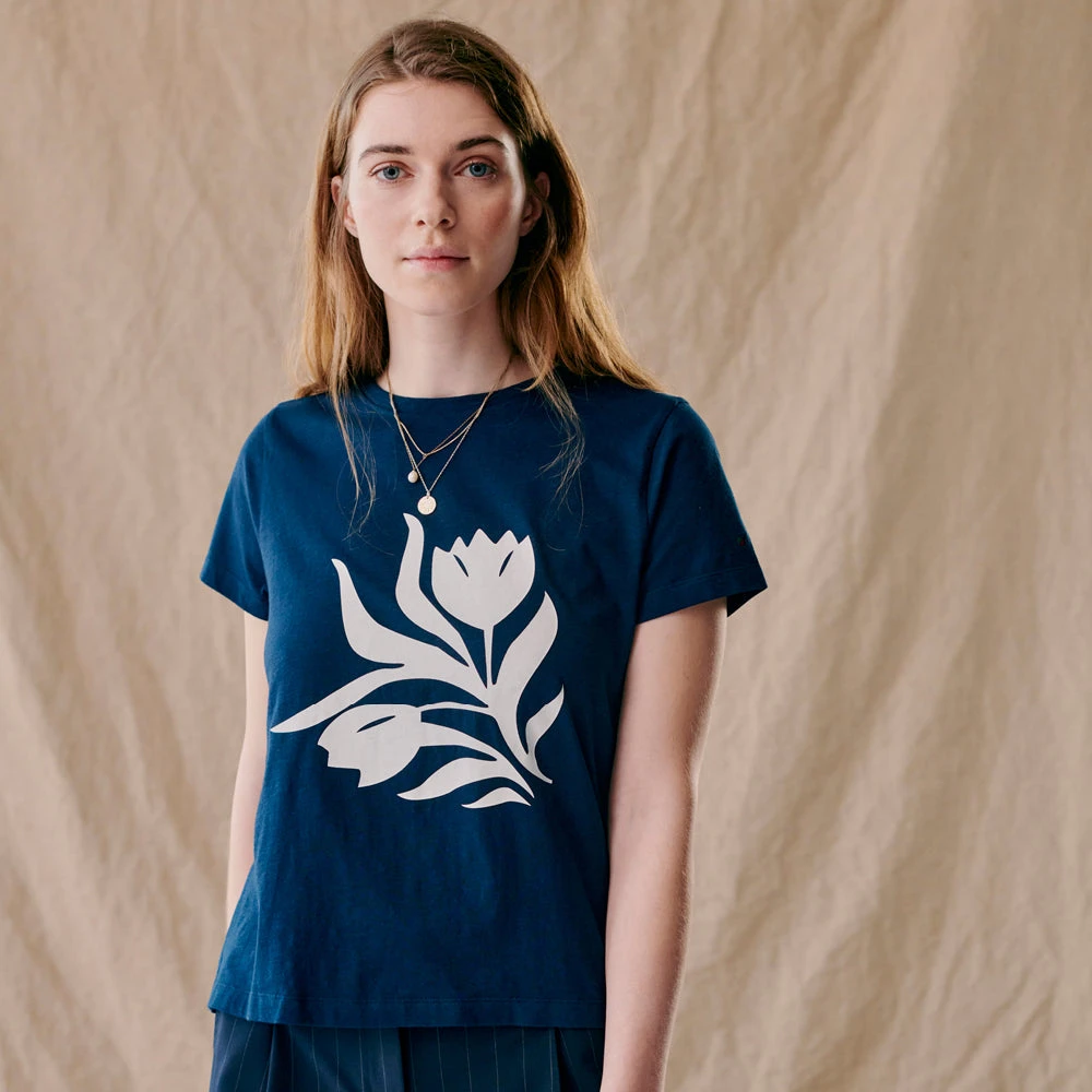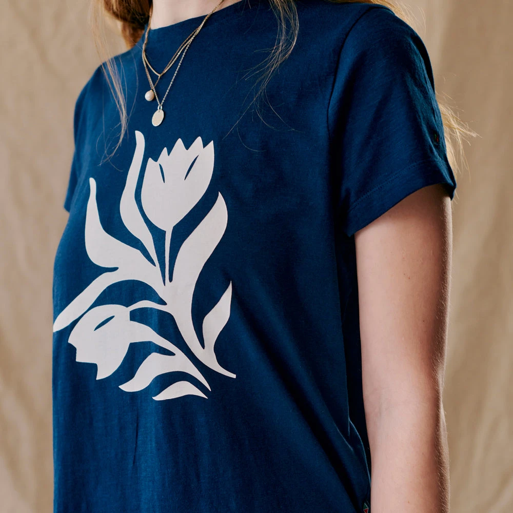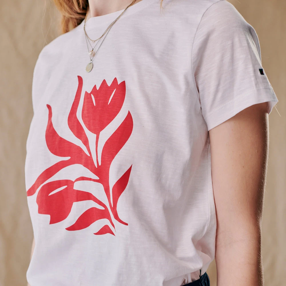 Flot t-shirt til kvinder, med blomster mønster foran. T-shirten har en lille slids i hver side.