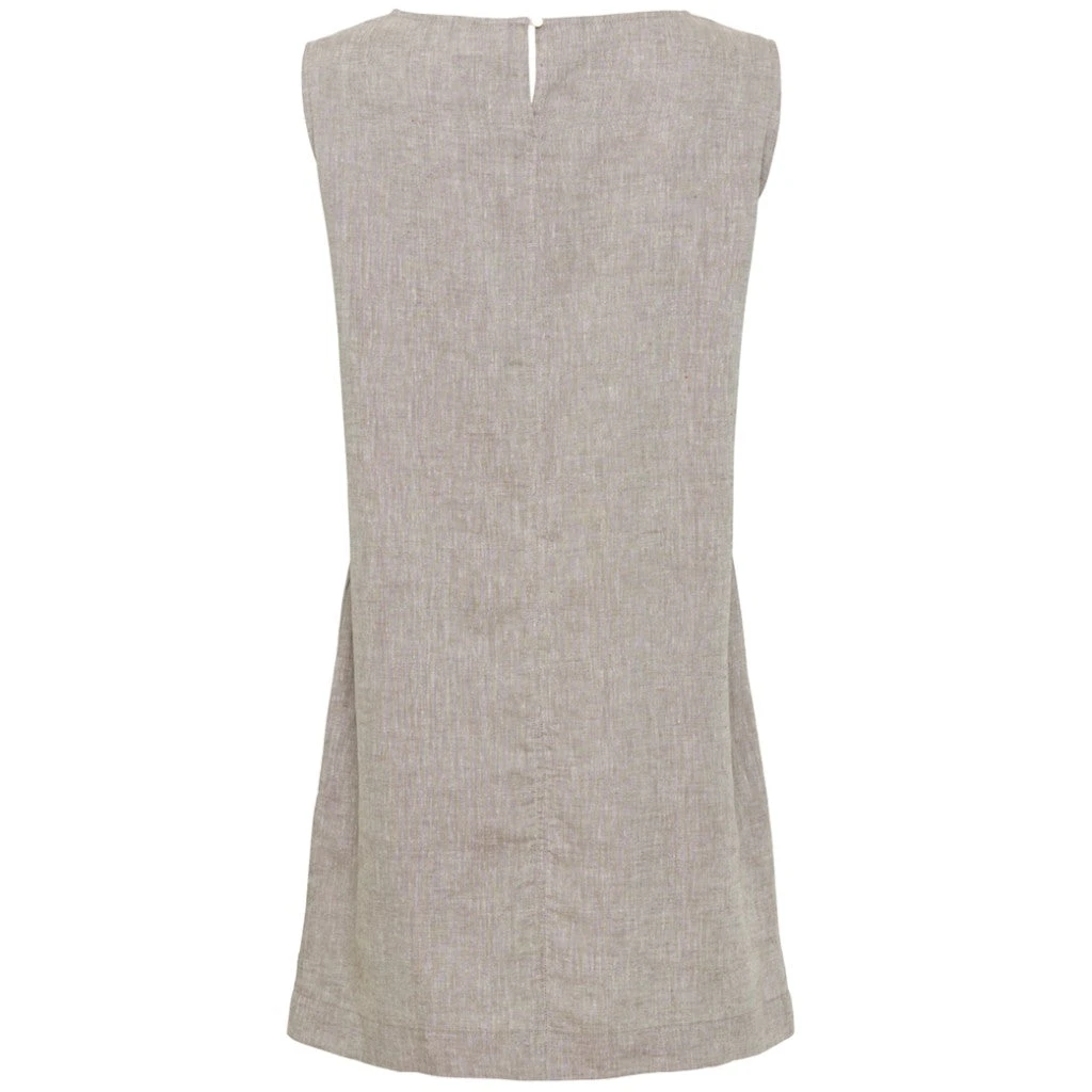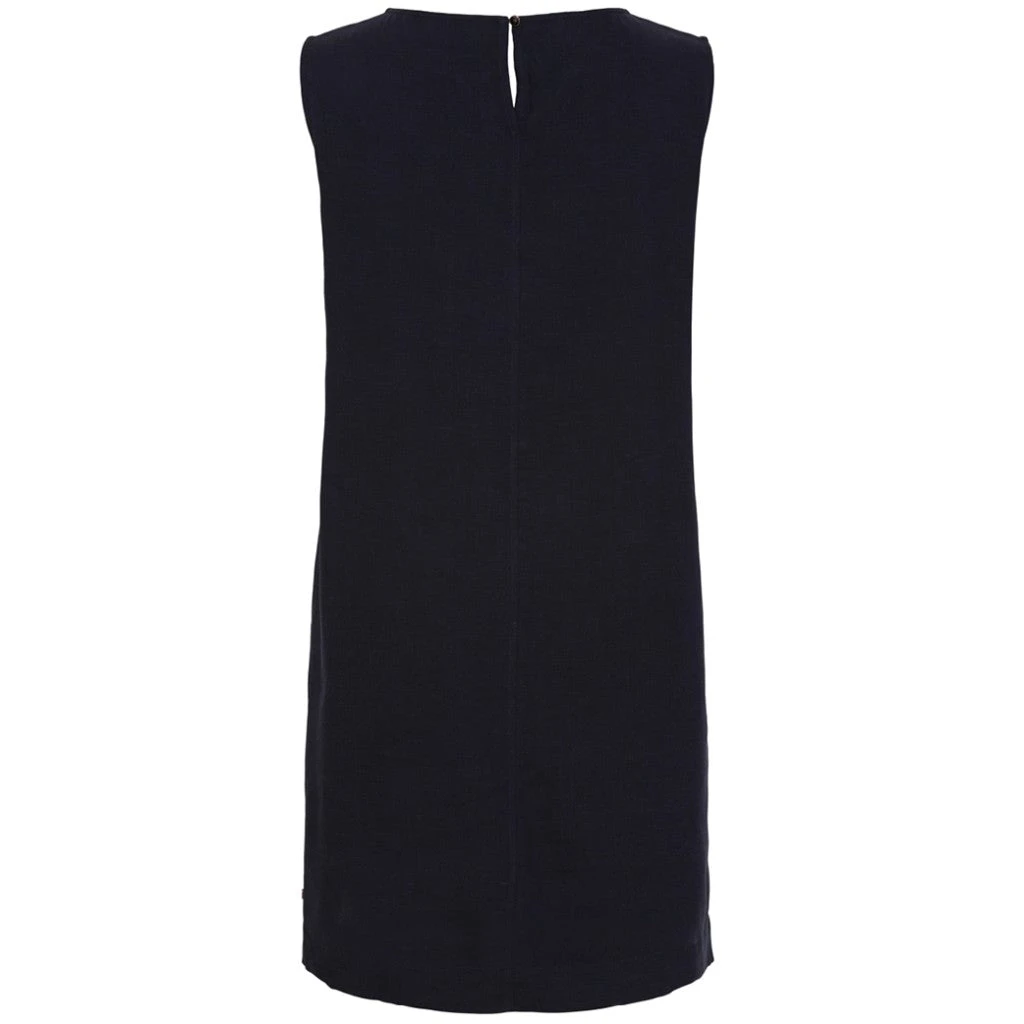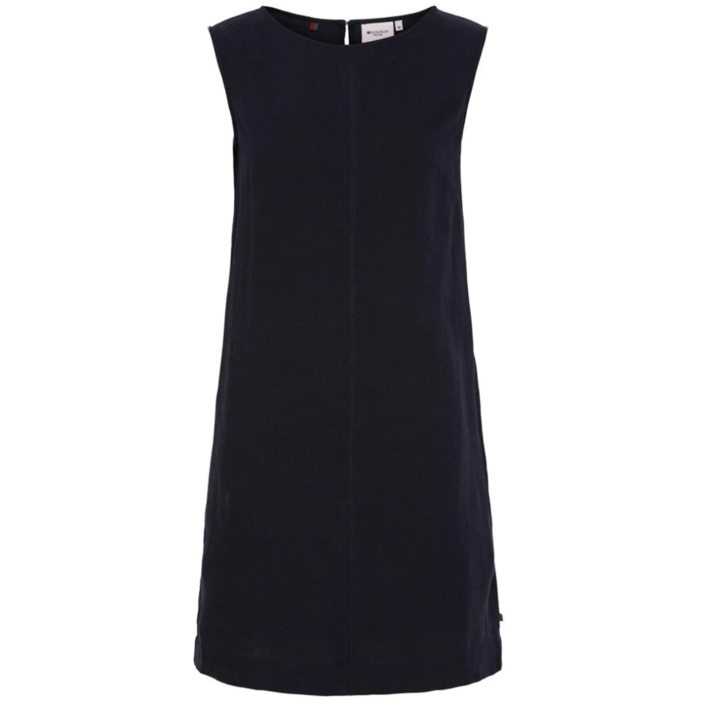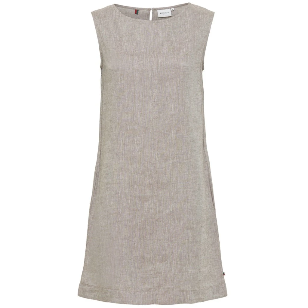 Sød let A-formet kjole, med skjulte sidelommer. Rund hals og lille slids midt bagpå med metalknap. Længden er 10 cm over knæet.