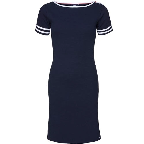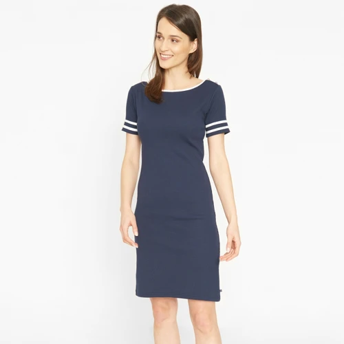 Klassisk knælang kjole fra Sea Ranch med korte ærmer. Kjolen er figursyet omkring taljen, så vi anbefaler at du tager vælger et nr. større end du plejer, kjolen produceret med 6% elastan, hvilket vil sige at kjolen kan give sig en lille smule. Kjolen har 2 striber på ærmerne, samt 2 knapper på venstre skulder.