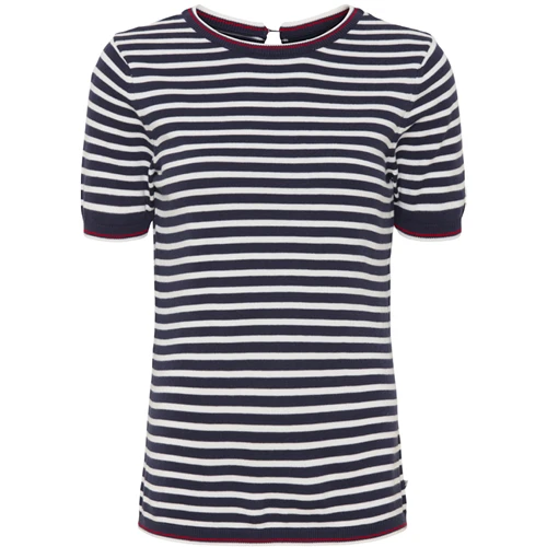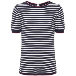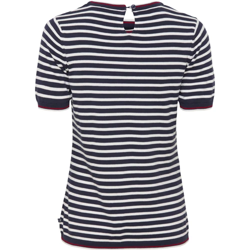 Sea Ranch Sofie T-shirten er en komfortabel og elegant striktrøje med korte ærmer. Den er designet i mørkeblå og hvide striber, med ribkanter på begge ærmer. T-shirten har en normal pasform med en lille åbning i ryggen, som kan lukkes via en knap i kontrastfarve.