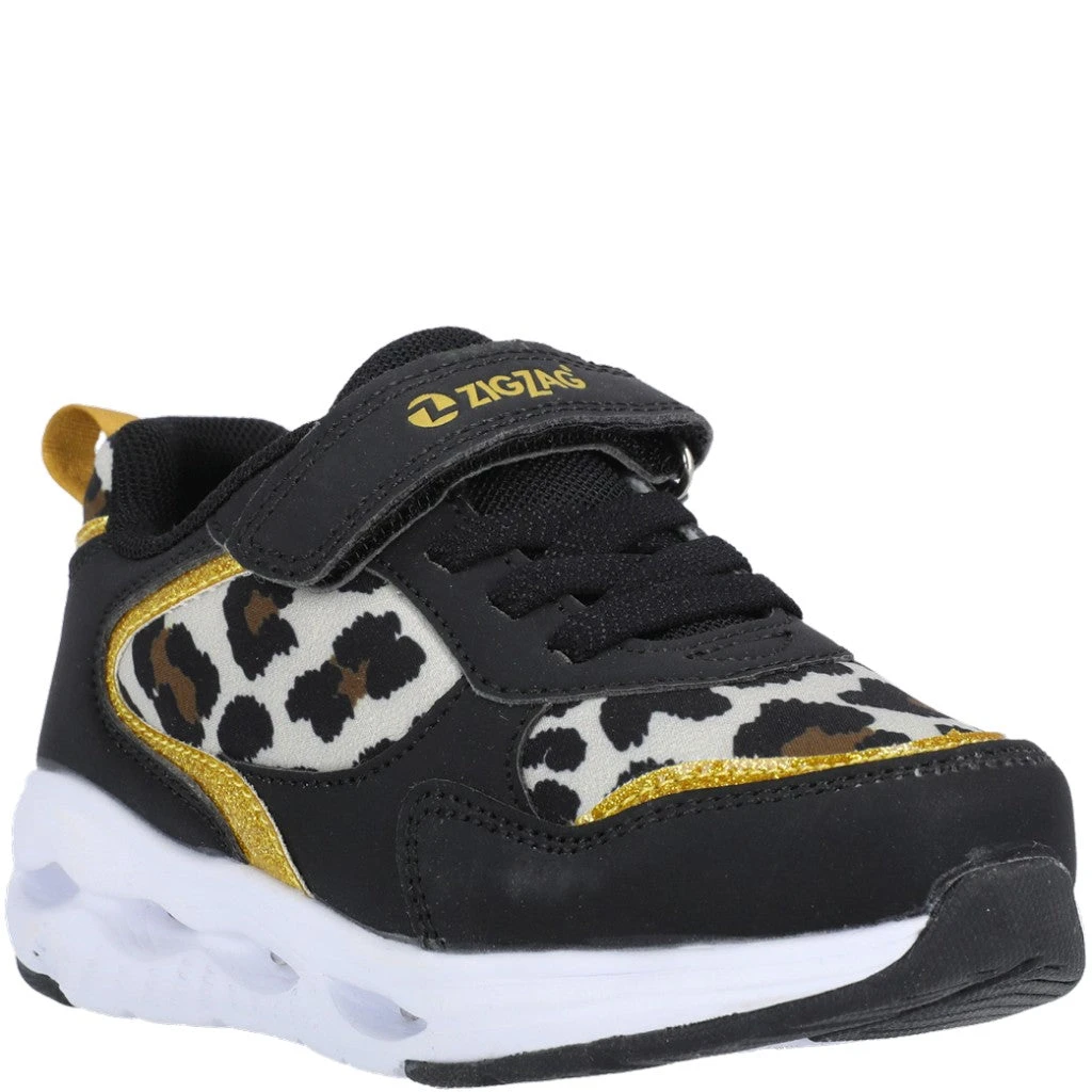 Flotte sko til børn fra ZigZag med leopartprint og glimmer. Skoen har blinke funktioner i sålen og er med velcrolukning og elastiksnørre, dette gør det lettere for børnene selv at tage dem af og på.
